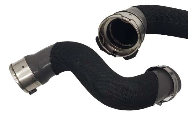 Charge air hoses are typically made from reinforced rubber, EPDM, or silicone, often layered with textile or wire reinforcement to withstand high pressure (up to 2 bar) and temperatures (up to 200°C).